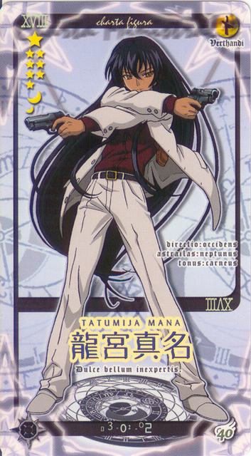 The daughter of the Tatsumiya Shrine on the Mahora academy grounds. She has knowledge of magic even before Negi Springfield arrived. She is not what one describes as sociable, since she keeps to herself most of the time and does not engage in conversation. She is also a mercenary, and mostly takes on contracts that pertain to hunting/destroying/exorcising demons and ghosts but will take on any job as long as she is paid well (she employs guns with spellbreaker bullets as her tool of exorcism). Her assignment during the Mahora Festival was to prevent confessions of love from occurring, although Chao also employed her during the Mahora Fighting Tournament. When on the job, she is extremely serious and straightforward, which at times can make her seem cold-hearted and quite frightening. She discovered Negi's secret when she helped rescue Konoka at Kyoto. She is also in the Biathlon club, as her apparent crush is the club's captain. Mana has the third largest breasts in class, and is the tallest girl. As such, she (and Kaede) are often mistaken for being older than middle school students. Strangely, Graf Herrmann never captured her when he fought Negi and Kotarou under the World Tree.